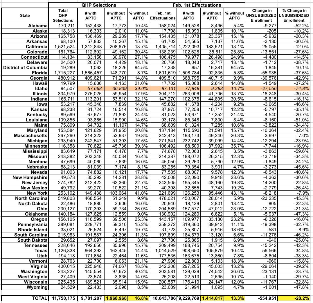 One other mildly noteworthy item here: Because of slight fluctuations in which people paid or didn't pay their first premium, both the average premium and average subsidy amount changed slightly in each state. Most of these are fairly nominal amounts, but in a few states they either increased or dropped by more than $10/month (highlighted).