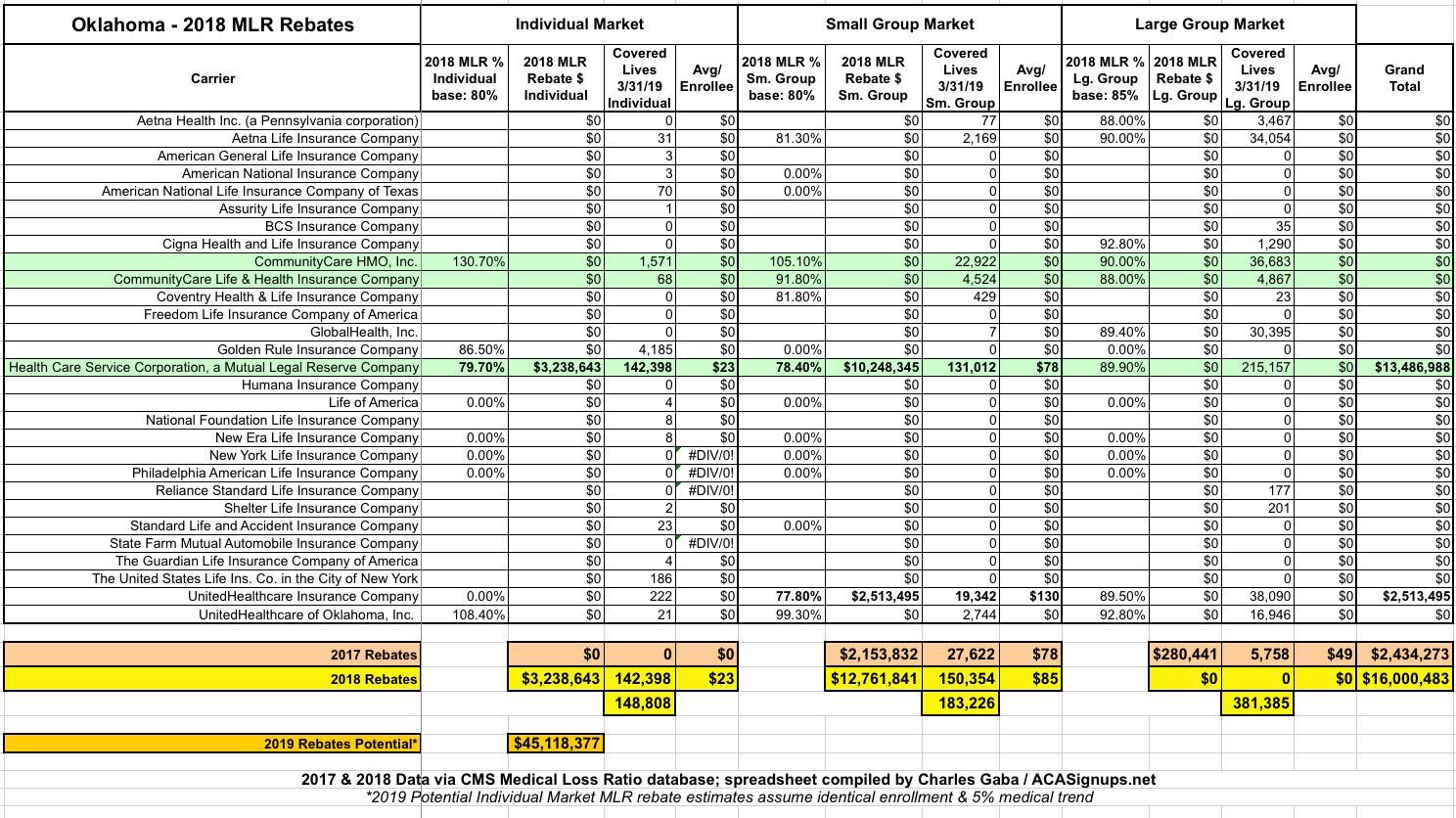 273,000 Blue Cross Blue Shield of Oklahoma enrollees will receive $16 million in MLR rebates this year...about half of them are on the Individual market, the other half in small group plans, although the group rebates are four times larger.
