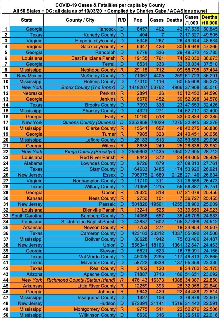 Here's the top 100 counties ranked by per capita COVID-19 fatalities as of Saturday, October 10th (click image for high-res version):