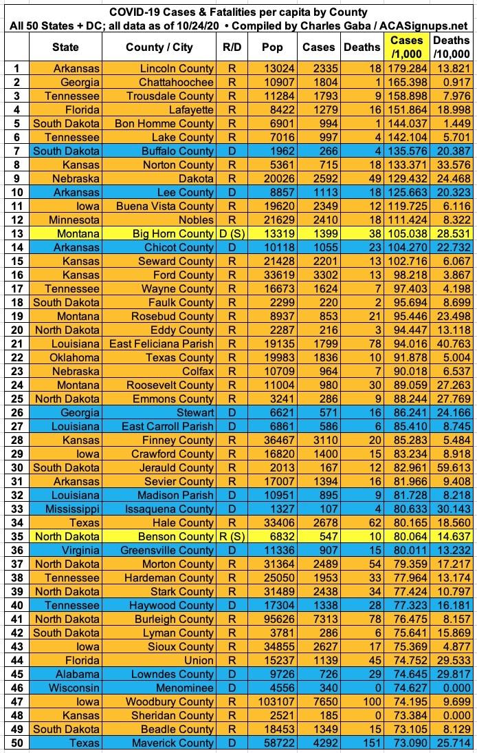 Here's the top 100 counties ranked by per capita COVID-19 fatalities as of Saturday, October 31st (click image for high-res version):