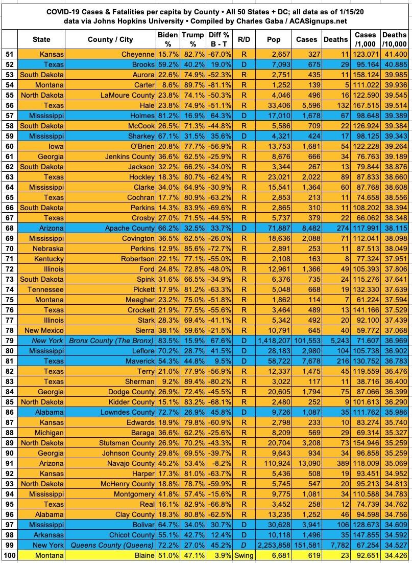 Here's the top 100 counties ranked by per capita COVID-19 fatalities as of Friday, January 15th, 2021 (click image for high-res version):