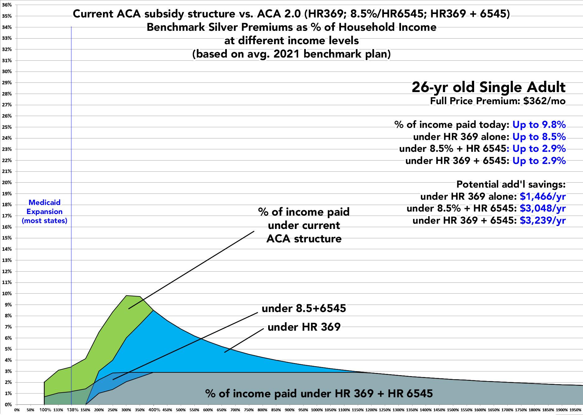 A 26-year old adult without any dependents would see significant savings under all three scenarios up to around 350% FPL (roughly $45,000/year). Over that income level, HR 369 wouldn't do anything for them, while HR 6545 would...but there's not a whole lot of 26-year olds earning over $50,000/year to begin with.