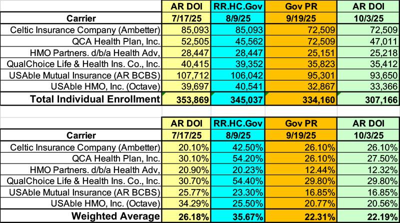In the most recent chapter of the ongoing 2026 Arkansas rate filing saga, I noted that both the total number of residents enrolled in ACA individual market policies as well as the average 2026 rate increases for the six insurance carriers participating in the individual market next year kept changing, often in ways which were contradictory with other numbers claimed within the same press releases: