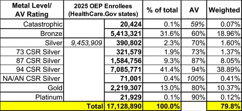 Using the 2025 OEP Public Use File, (and with an assist from Dave Anderson & Andrew Sprung), the weighted average AV for current ACA exchange enrollees looks to be around 79.8% overall...for the 31 HealthCare.Gov states, anyway (I'm still tracking down the CSR Silver breakout for the 20SBM states and will update this table accordingly):