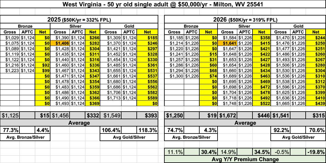 Therefore, I'm again focusing on the 200 - 400% FPL income bracket: A single 50-yr old adult earning $50,000/year, which is 332% FPL in 2025 and will be 319% FPL in 2026.