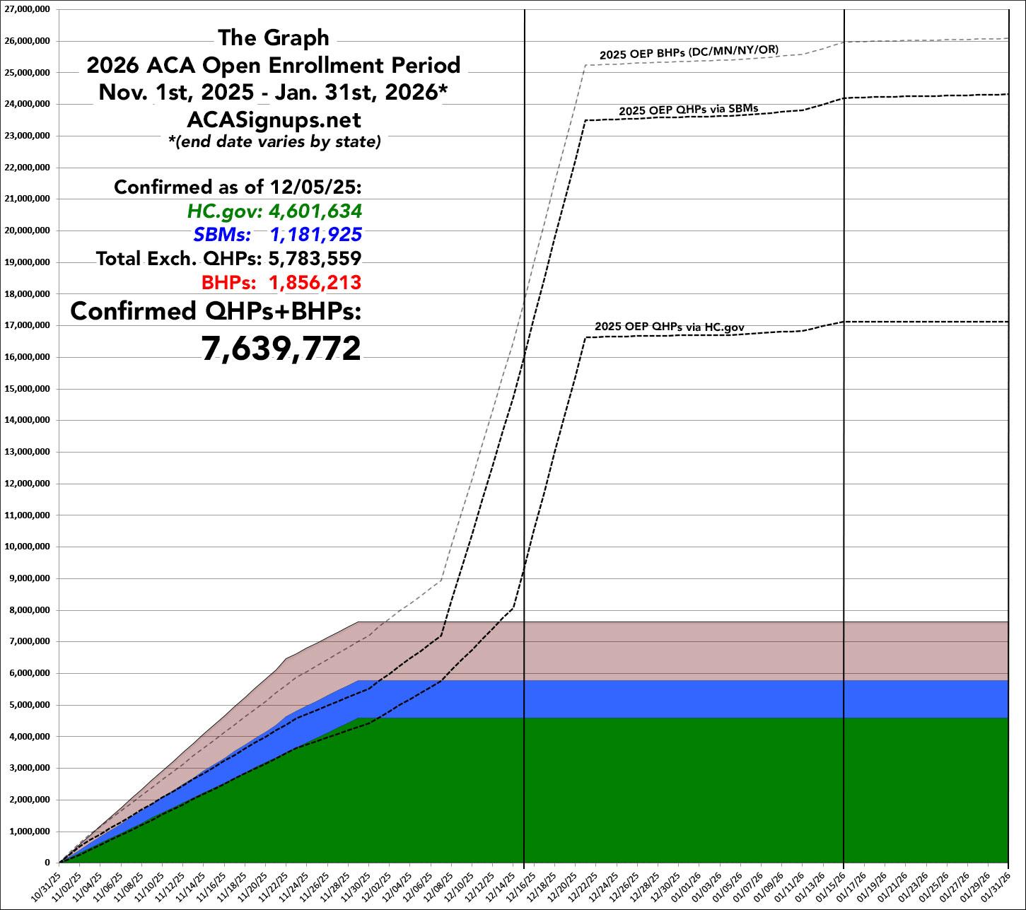 In any event, when I plug today's data dump into The Graph, it looks like so (again, the dotted lines show how the 2025 Open Enrollment Period progressed a year ago):