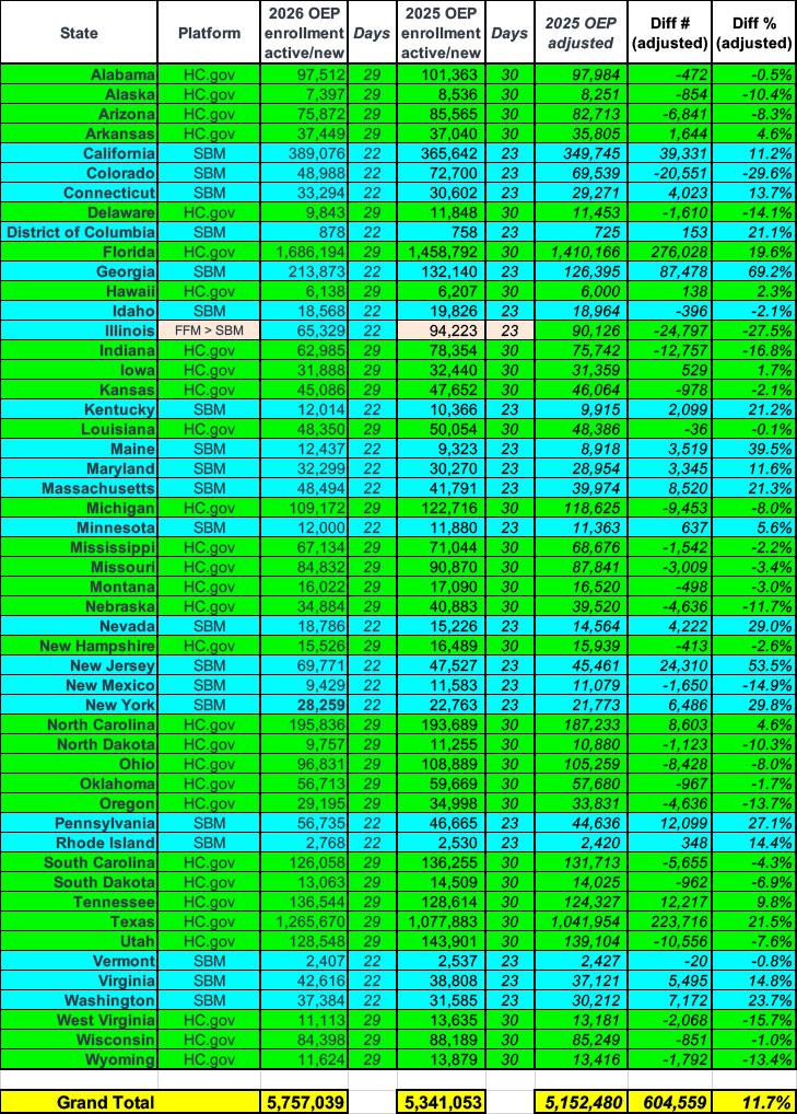 On top of that, there's also another important adjustment: Illinois, which enrolled nearly 466,000 people during the 2025 Open Enrollment Period, moved off of the federal exchange onto their own platform this year, which means you have to adjust for both the HC.gov and SBE data.