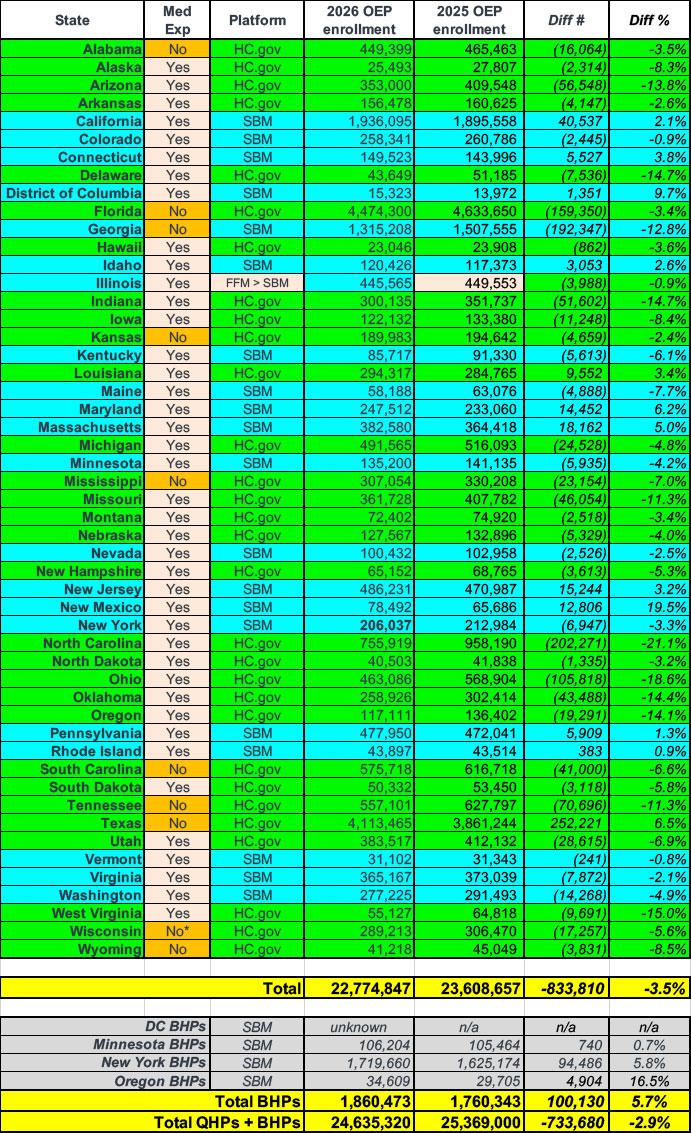 In any event, now that the 2026 ACA Open Enrollment Period is nearly finished and the Centers for Medicare & Medicaid Services (CMS) has published a semi-final breakout of actual exchange enrollment by state, I decided to break those numbers out in several different ways. Unfortunately, it will be awhile before I'm able to do so by Congressional District, but I can at least do so at the state level.
