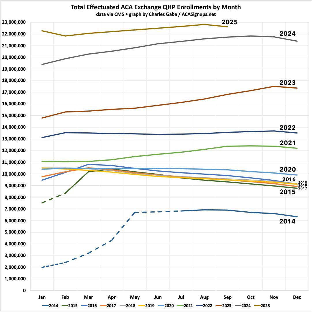 The table below lays all of this out more accurately. The effectuated enrollment numbers for 2014 and 2015 are a bit spotty as the Centers for Medicare & Medicaid Services were a bit scattershot about tracking that data the first couple of years (thus the rounded off greyed-out cells below), but the exact numbers for January 2016 - July 2025 are available via the (CMS) website.