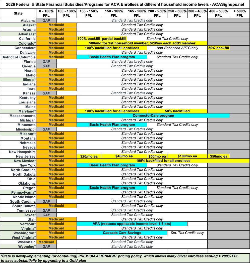 As a reminder, here's a table breaking out the different state subsidy programs being offered this year by various states. The blue ones are programs which were already in place prior to 2026; the yellow ones are being newly implemented.