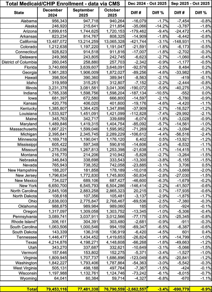 As for my concerns about potential manipulation of data by the Musk/Trump Admin, once again I'm still not seeing any obvious red flags. Between December 2024 and October 2025, net Medicaid/CHIP enrollment has dropped by around 2.66 million, or 3.4%, for whatever that's worth.