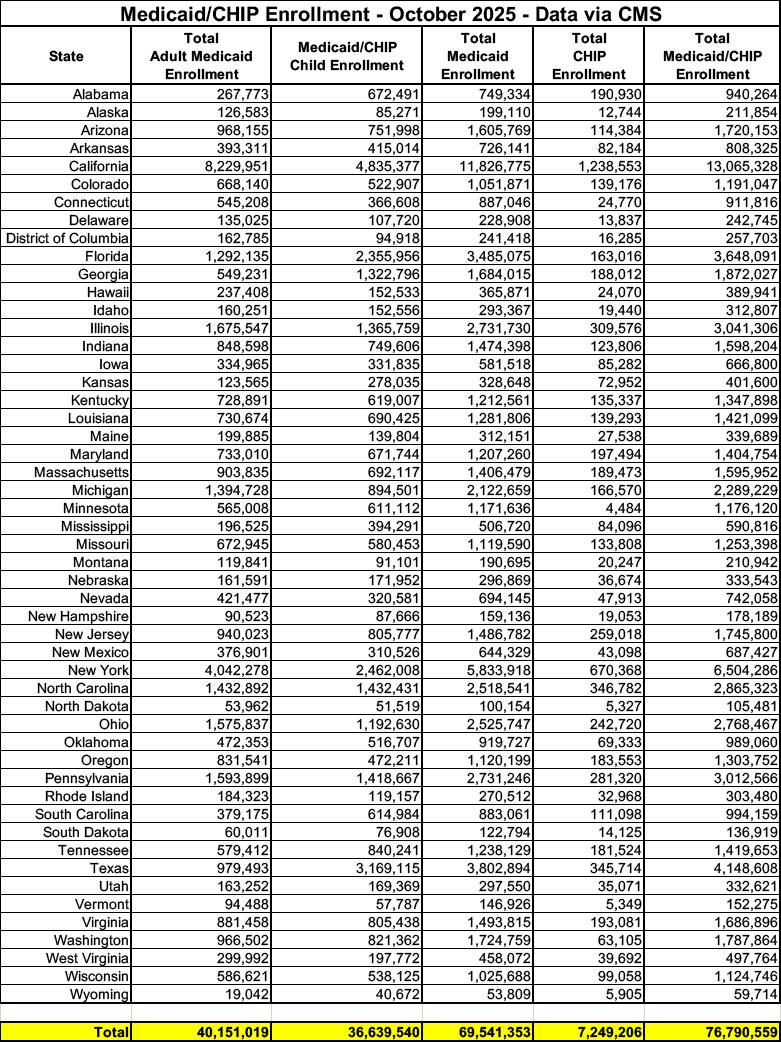 Total Medicaid/CHIP enrollment in October 2025 of ~76.8 million dropped about 0.9% from September 2025, or by around 690,000 people.
