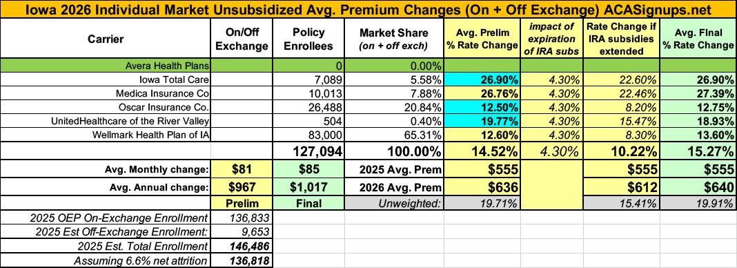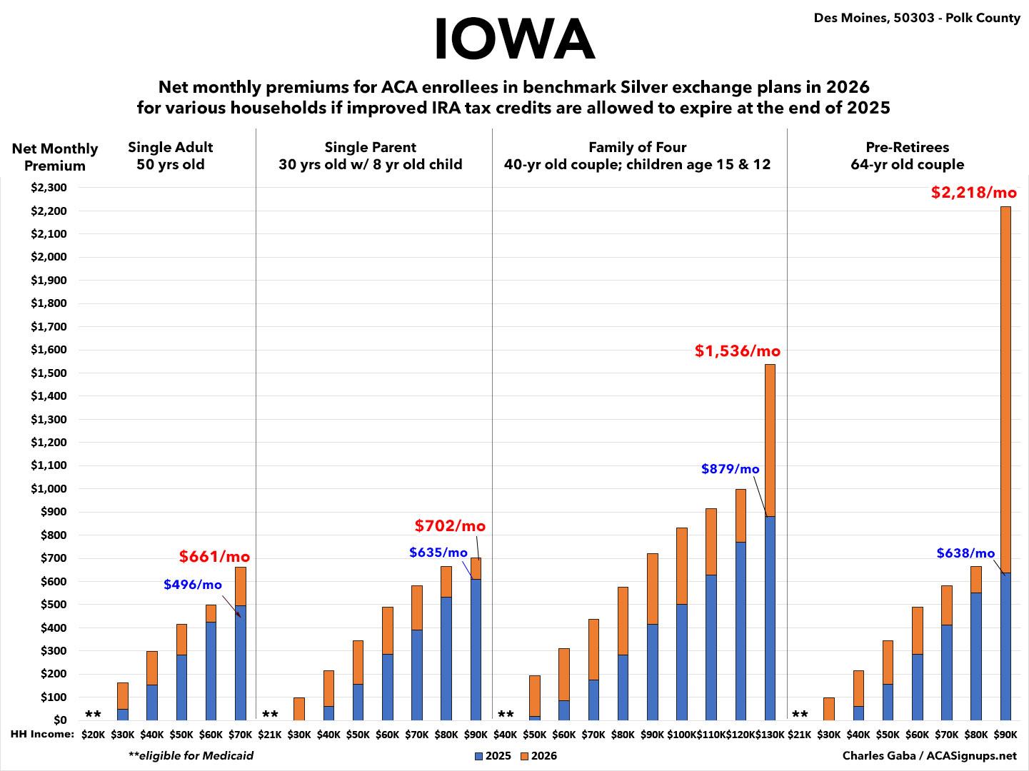 Iowa has around 136,000 residents enrolled in ACA exchange plans, 88% of whom are currently subsidized. I estimate they also have another ~9,600 unsubsidized off-exchange enrollees.