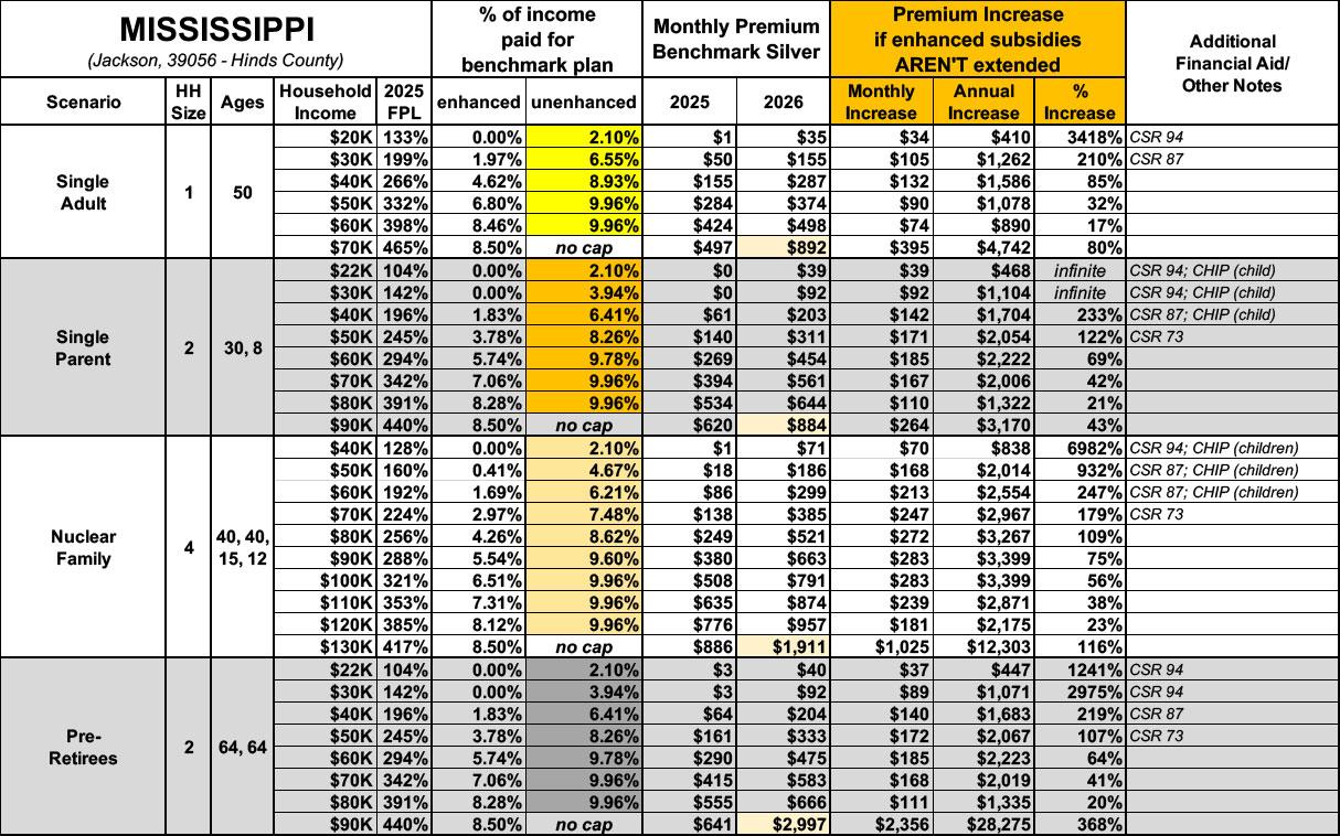 Mississippi has around ~338,000 residents enrolled in ACA exchange plans, 98% of whom are currently subsidized. I estimate they also have another ~14,000 unsubsidized off-exchange enrollees.