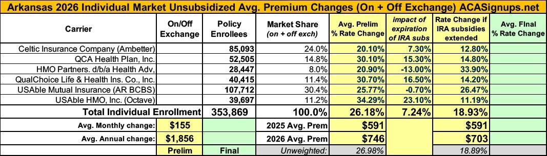 Back in July I posted my analysis of the preliminary 2026 rate filings by the 6 Arkansas insurance carriers participating in the individual market. At the time, they looked like this: