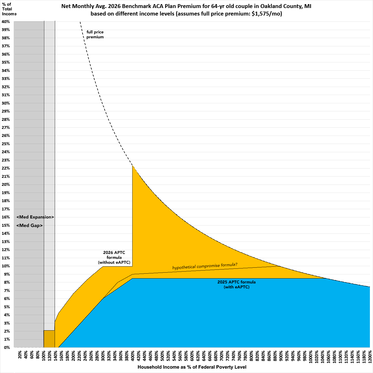 As an aside, as a reminder, the graph below is a visual representation of what we're talking about here: It's based on a 64-yr old couple in Oakland County, Michigan enrolled in the 2025 benchmark Silver plan; the actual 2026 plan will likely cost around 17% more at full price.