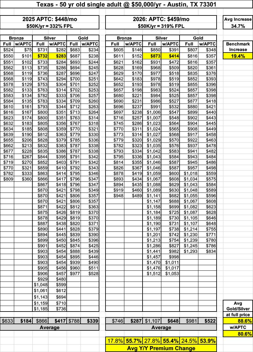 First, the ground rules: Since those who earn less than 200% FPL are usually better off with Silver plans and those who earn over 400% FPL aren't going to be eligible for APTC subsidies at all starting in January, for all examples I'm using a 50-yr old single adult who earns $50,000/year, which is 332% FPL in 2025 and 319% FPL in 2026.