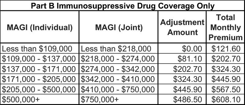 ...Beginning in 2023, individuals whose full Medicare coverage ended 36 months after a kidney transplant, and who do not have certain other types of insurance coverage, can elect to continue Part B coverage of immunosuppressive drugs by paying a premium. For 2026, the standard immunosuppressive drug premium is $121.60.