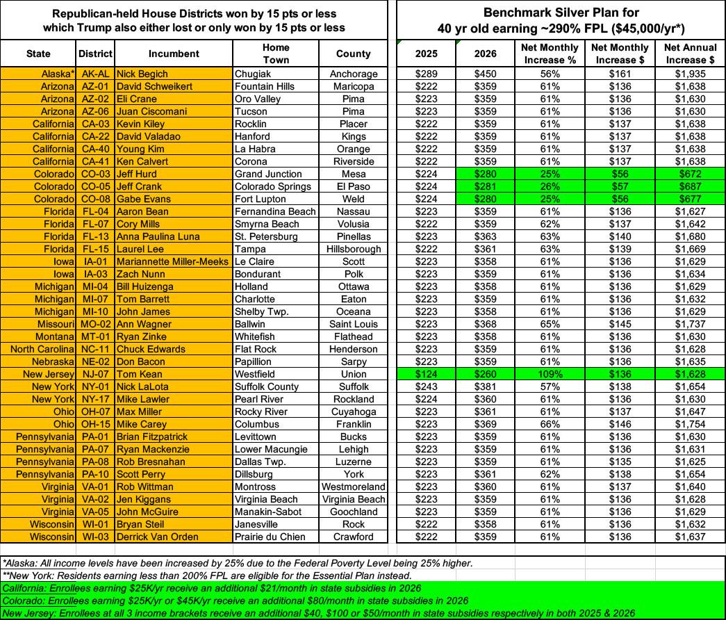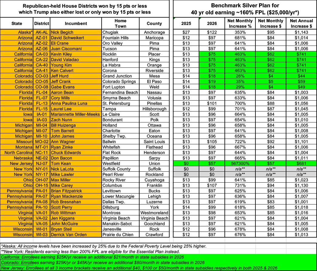 In NY-01 (Nick LaLota), a 60-yr old enrollee will go from paying just $480 to $877/month...an 83% rate hike. And that's the least-dramatic example.