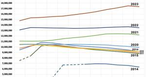 - 2023: OEP: 16.3M; Peak: 17.5M; Final: 17.4M; Average: 16.15M (99% of OEP)