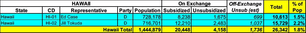 Hawaii has around 26,000 residents enrolled in ACA exchange plans, 83% of whom are currently subsidized. I estimate they also have perhaps another ~1,700 unsubsidized off-exchange enrollees.