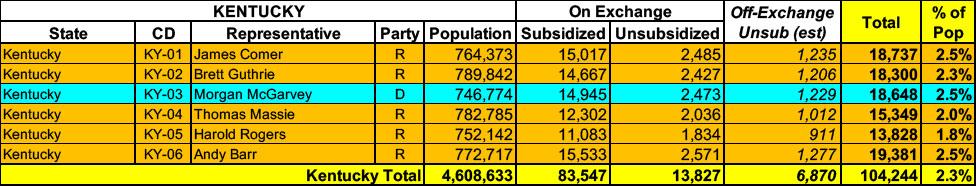 Kentucky has around 97,000 residents enrolled in ACA exchange plans, 86% of whom are currently subsidized. I estimate they also have another ~6,800 unsubsidized off-exchange enrollees.