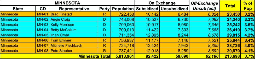 Minnesota has around 151,000 residents enrolled in ACA exchange plans, 61% of whom are currently subsidized. I estimate they also have another ~62,000 unsubsidized off-exchange enrollees.