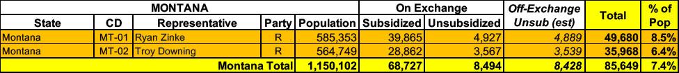 Montana has around ~77,000 residents enrolled in ACA exchange plans, 89% of whom are currently subsidized. I estimate they also have another ~8,400 unsubsidized off-exchange enrollees.