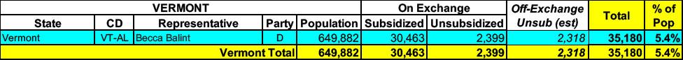 Vermont has around ~32,000 residents enrolled in ACA exchange plans, 93% of whom are currently subsidized. I estimate they also have another ~2,000 unsubsidized off-exchange enrollees.