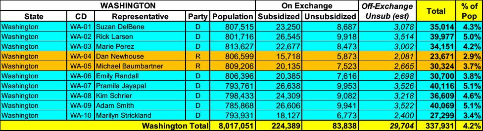 Washington State has around ~308,000 residents enrolled in ACA exchange plans, 73% of whom are currently subsidized. I estimate they also have another ~29,000 unsubsidized off-exchange enrollees.