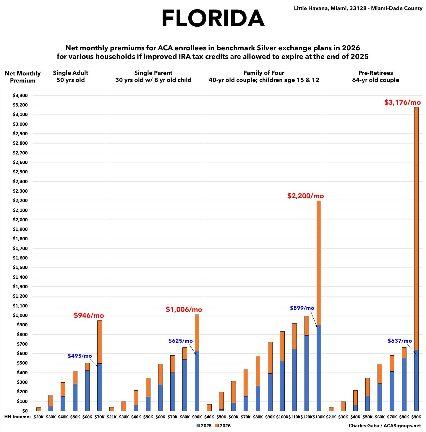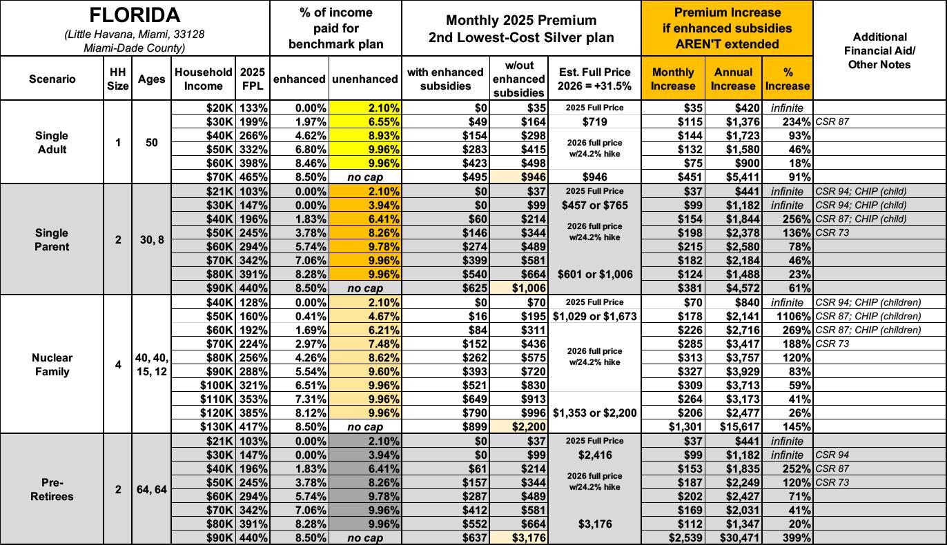The original version of this analysis included a 4.3% increase in the unsubsidized benchmark plan premium based on a projection by the Congressional Budget Office. However, that was a national average projection which didn’t take into account other factors like increased utilization, medical inflation and so on. This updated version assumes the actual 2026 Florida rate filings.