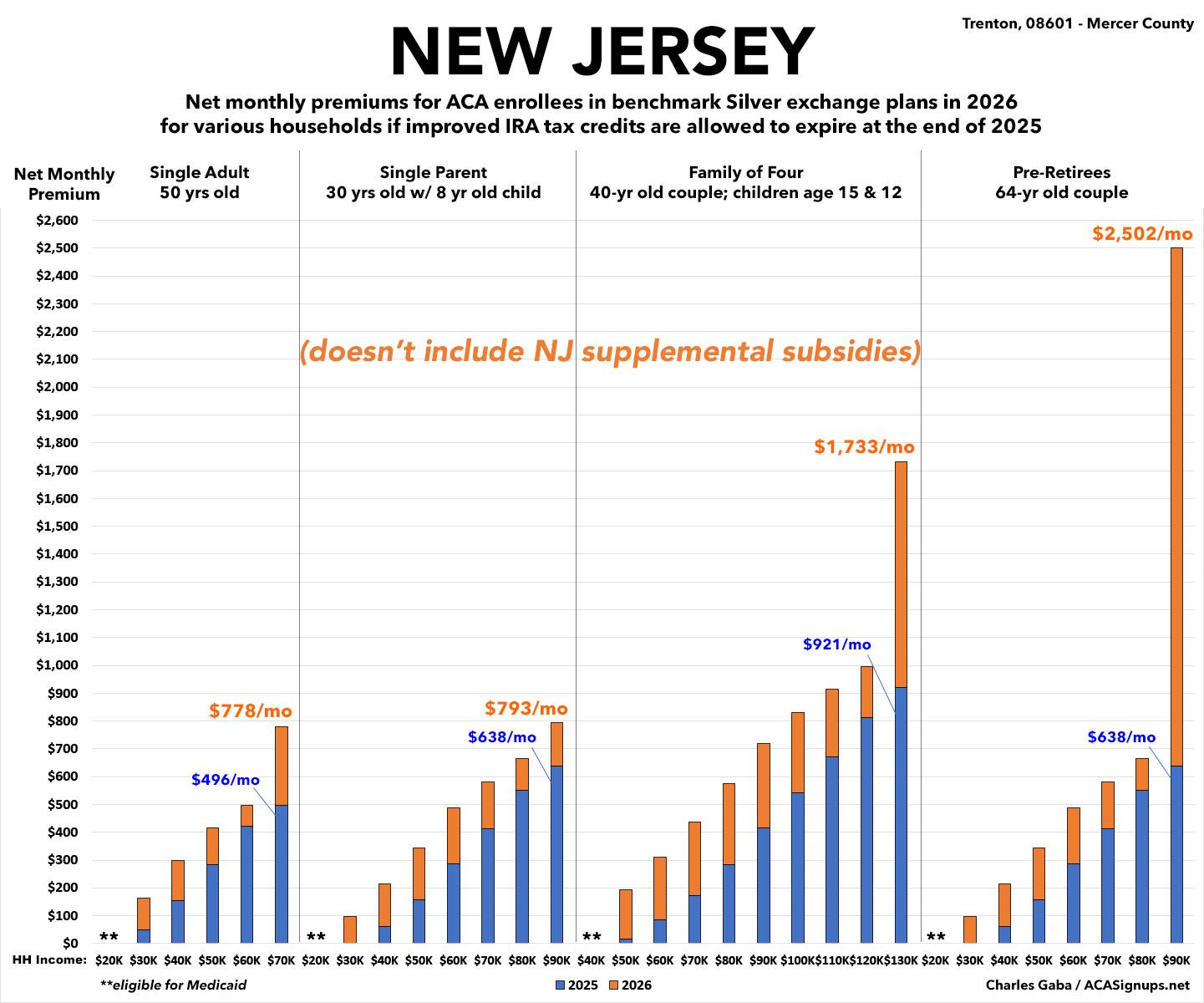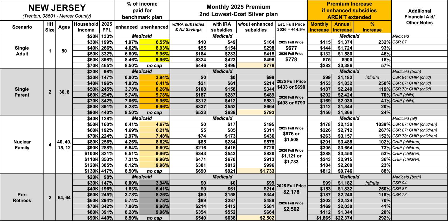• New Jersey has their own state-level supplementary premium subsidy program on top of the federal one, but I'm not sure how that will be impacted by the IRA subsidies expiring. I've included these in the table below but not on the graph at the bottom of this entry.