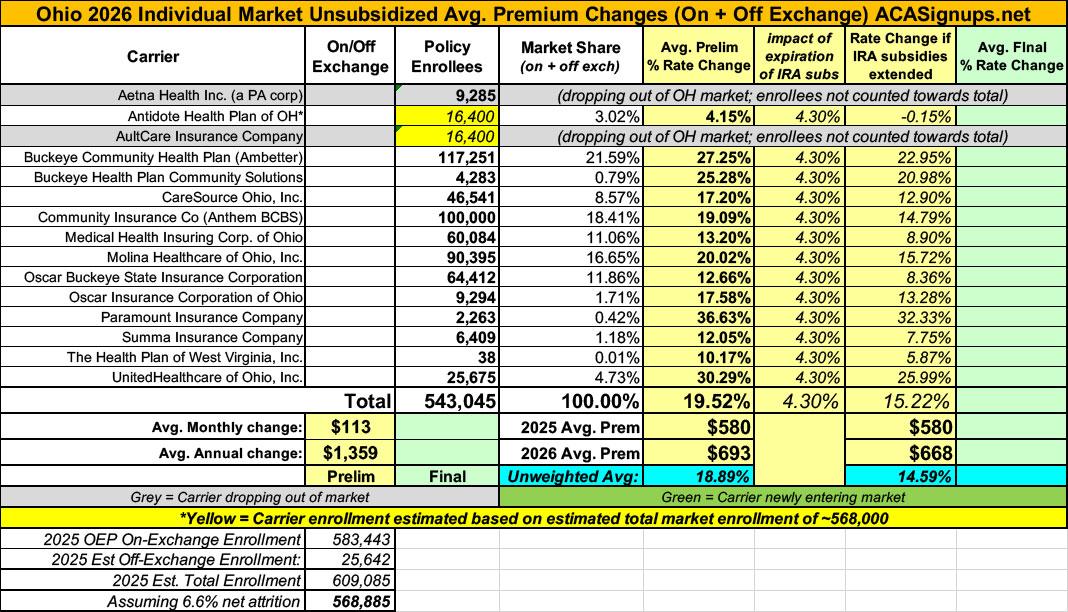 Ohio has around ~583,000 residents enrolled in ACA exchange plans, 91% of whom are currently subsidized. I estimate they also have another ~25,000 unsubsidized off-exchange enrollees.