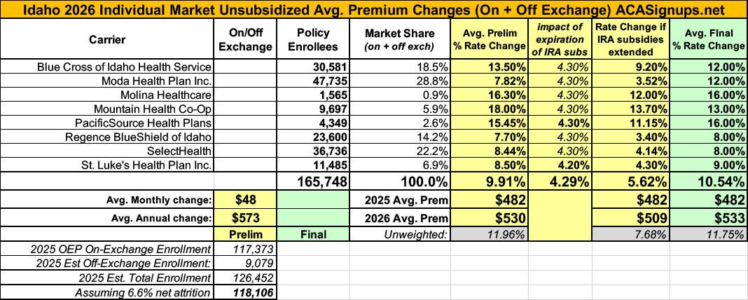 UPDATE 10/01/25: The Idaho Insurance Dept. has published the final/approved 2026 rate filings for both the individual & small group markets.