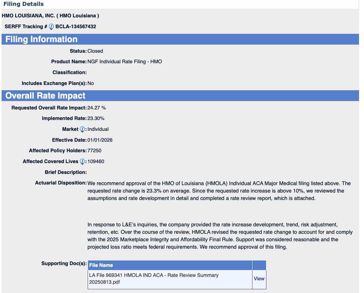 UPDATE 8/14/25: Ambetter and HMO Louisiana have submitted revised filings which, combined with my revising my estimate of the total LA individual market down to 286,000, results in the weighted average rate increase going up by 2 points to 23.9%.